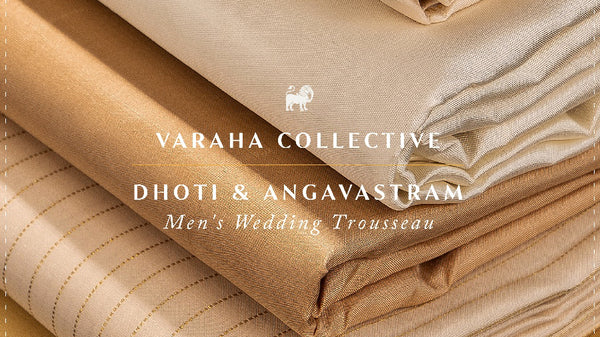 Introducing Varaha, a curated collection of men's wedding trousseau by Muhurth, featuring traditional angavastram sets along with impeccably coordinated fabric lengths for shirts, kurtas and sherwanis, all intricately woven in the finest Kanjivaram silk. Designed to complement Muhurth's luxurious bridal sarees, this collection showcases a harmonious blend of heritage and modernity, with fabrics adorned in checks, tone-on-tone embellishments, and micro patterns inspired by the timeless Kanjivaram craft. The opulence of silver and gold zari highlights the rich textures, making each piece a masterpiece.