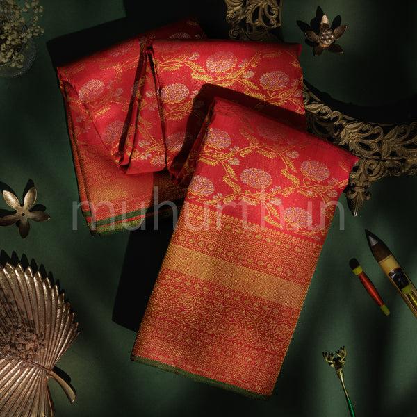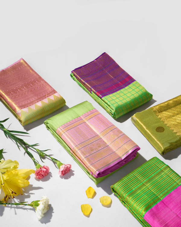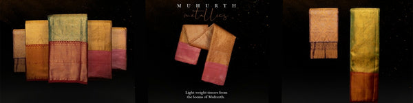 Metallics are complete luminous and lustrous tissue sarees that are weaved with Zari as their base. This is considered to be the utmost sophisticated kind in Kanjivaram. At Muhurth, we have handmade the Metallics collection with our most sophisticated looms in our own factory base ensuring that each and every detail is at its finest and all intricacies are generously added. Experience the true feeling of timeless and luxury Kanjivarams in this collection.