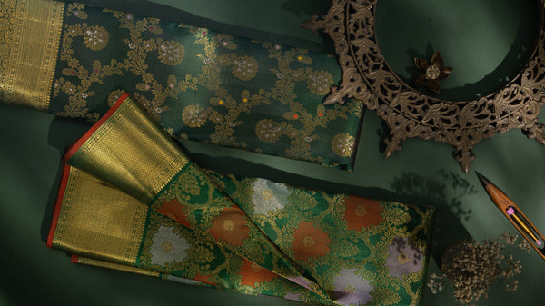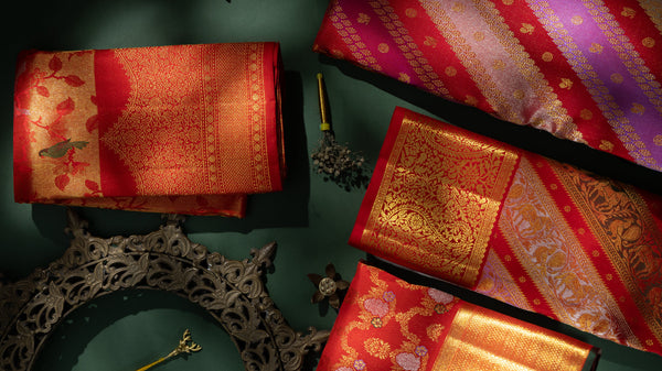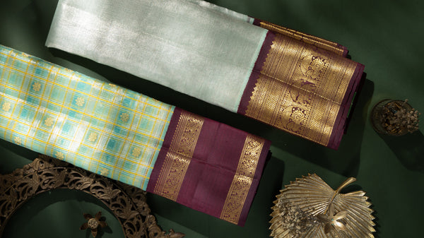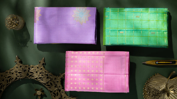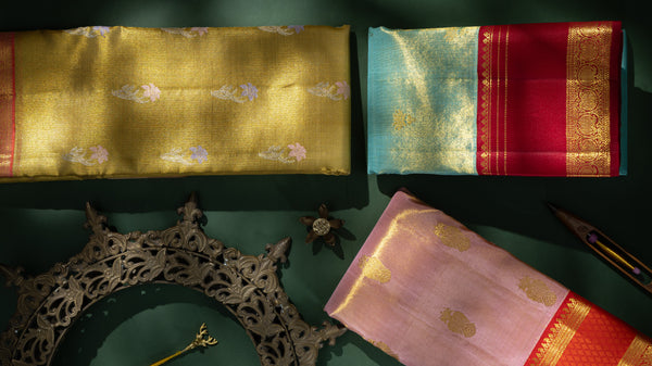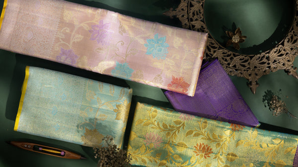This rare construction lends tissue Kanjivarams their unmistakable character, layered luminosity with a quiet, commanding presence. Handwoven in Kanchipuram by highly skilled artisans, these sarees are regarded as the pinnacle of opulence, where classical weaving techniques meet avant-garde design sensibilities, making them equally suited for ceremonial grandeur and refined occasions.