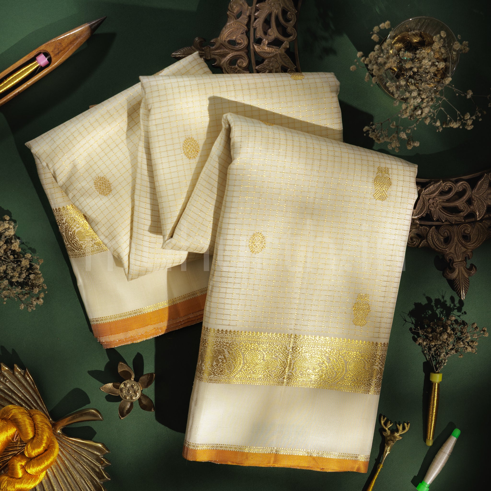 Woven in a refined off-white tone, this Vaira Oosi Kattam Pure Kanjivaram silk saree reflects quiet grandeur and classical beauty. The body is detailed with Vaira Oosi checks, gracefully accented by Gandaberunda and Chakram buttas, lending depth without overwhelming the palette. Anchoring the saree is a Kaal Eragina border, richly adorned with royal peacocks and elephants, finished with a mustard selvedge highlight that adds warmth and definition. A grand traditional pallu carries the same stately elegance, while the look is completed with an oosi-striped blouse featuring coordinated buttas. Balanced, elegant, and deeply rooted in tradition, this saree is a classic choice for weddings, ceremonies, and all auspicious occasions.