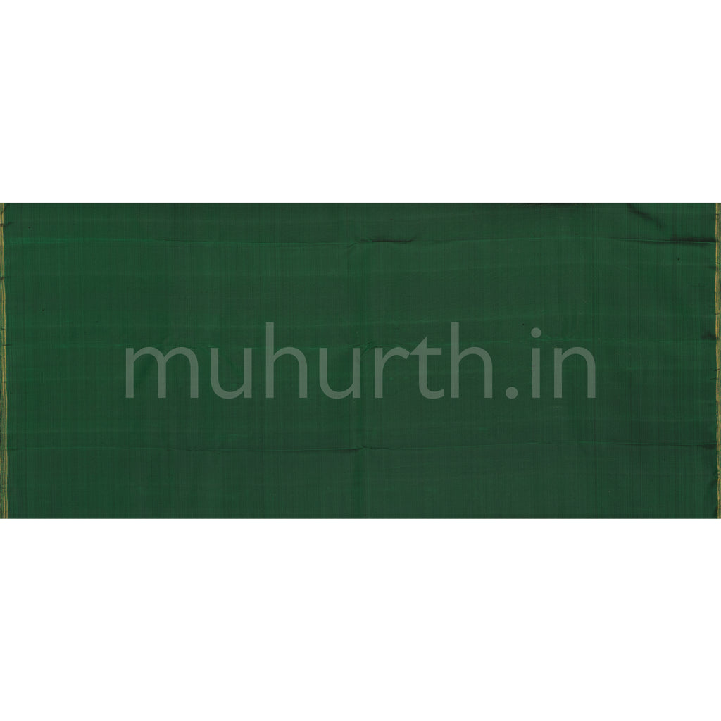 In the timeless Vanasingaram weave, this Pure Zari Kanjivaram in black and green evokes the splendour of nature and the finesse of vintage craftsmanship. The body carries the intricate forest-inspired brocade in silk, framed by a delicate zari line along the green selvedge. A deep green pallu steeped in tradition and a plain blouse complete the look making it a saree that speaks of artistry preserved through generations.