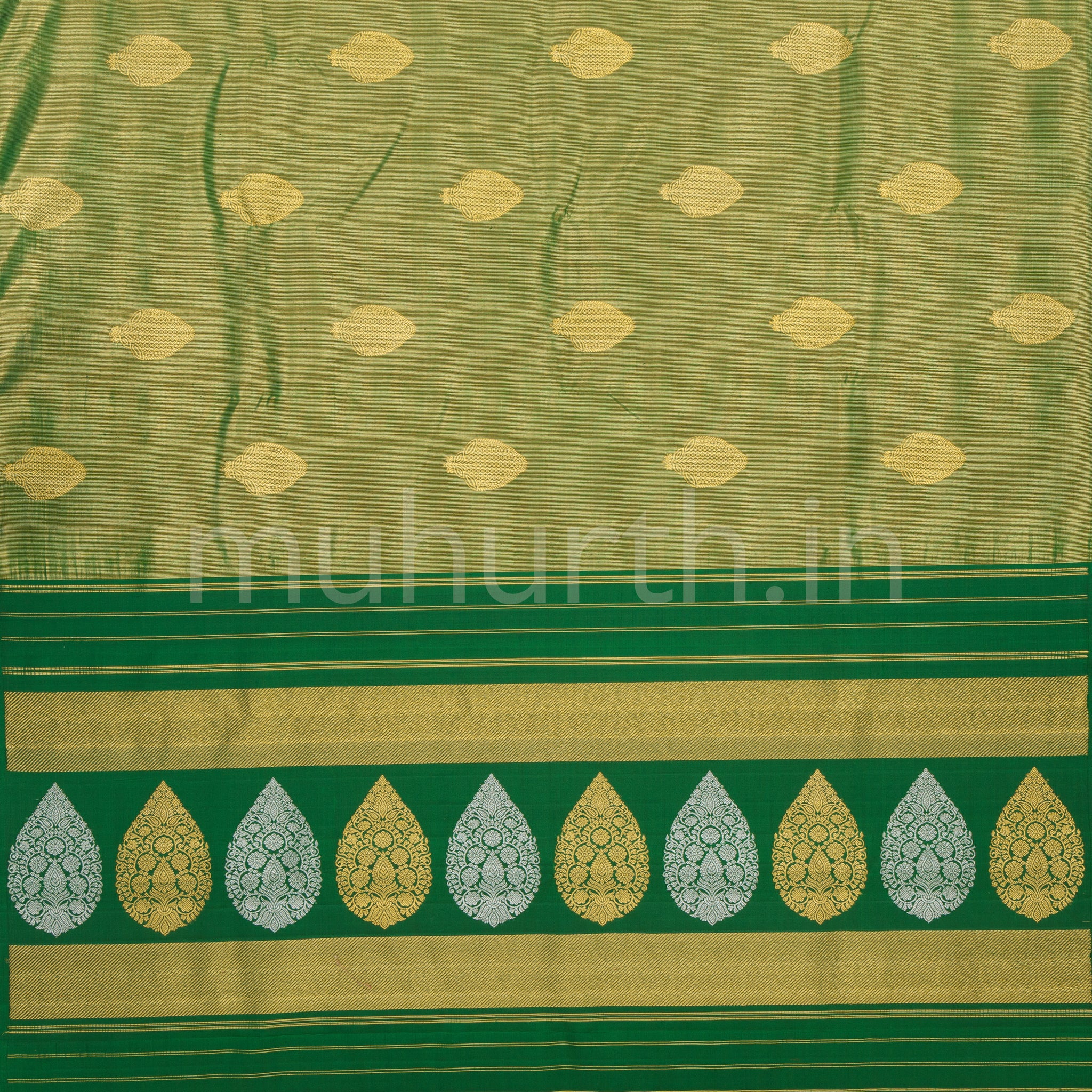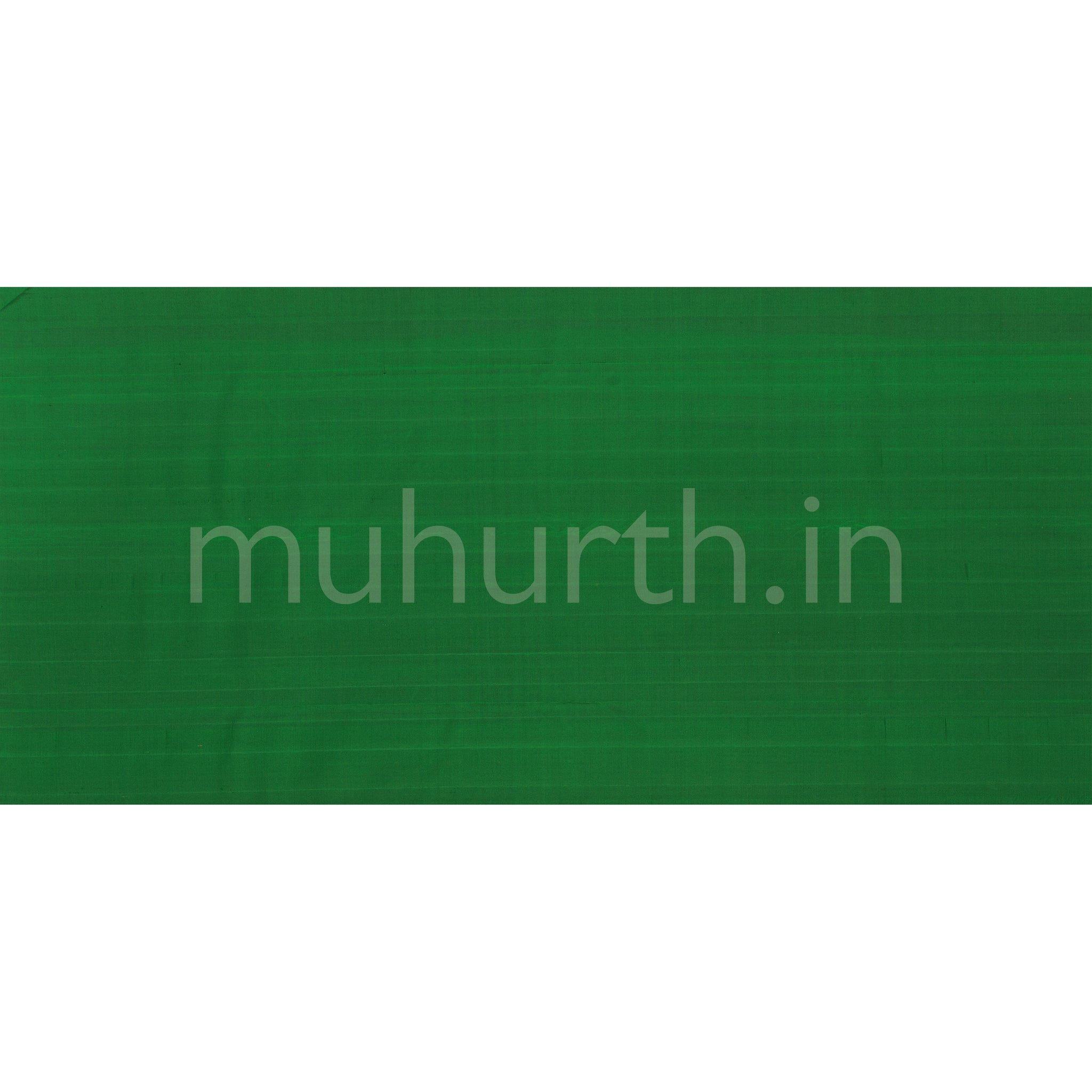 This bright green pure Kanjivaram silk saree is defined by elegant zari stripes complemented by contemporary buttas woven in gold zari across its shimmering body. Crafted without a border, it maintains a clean monotone aesthetic with a distinctly modern appeal. The pallu features thilagam buttas in a dual zari tone introducing a subtle contrast to the overall drape. It is paired with a plain green blouse, completing the look with balance and refinement. A versatile choice for receptions, weddings, birthday celebrations and office functions.
