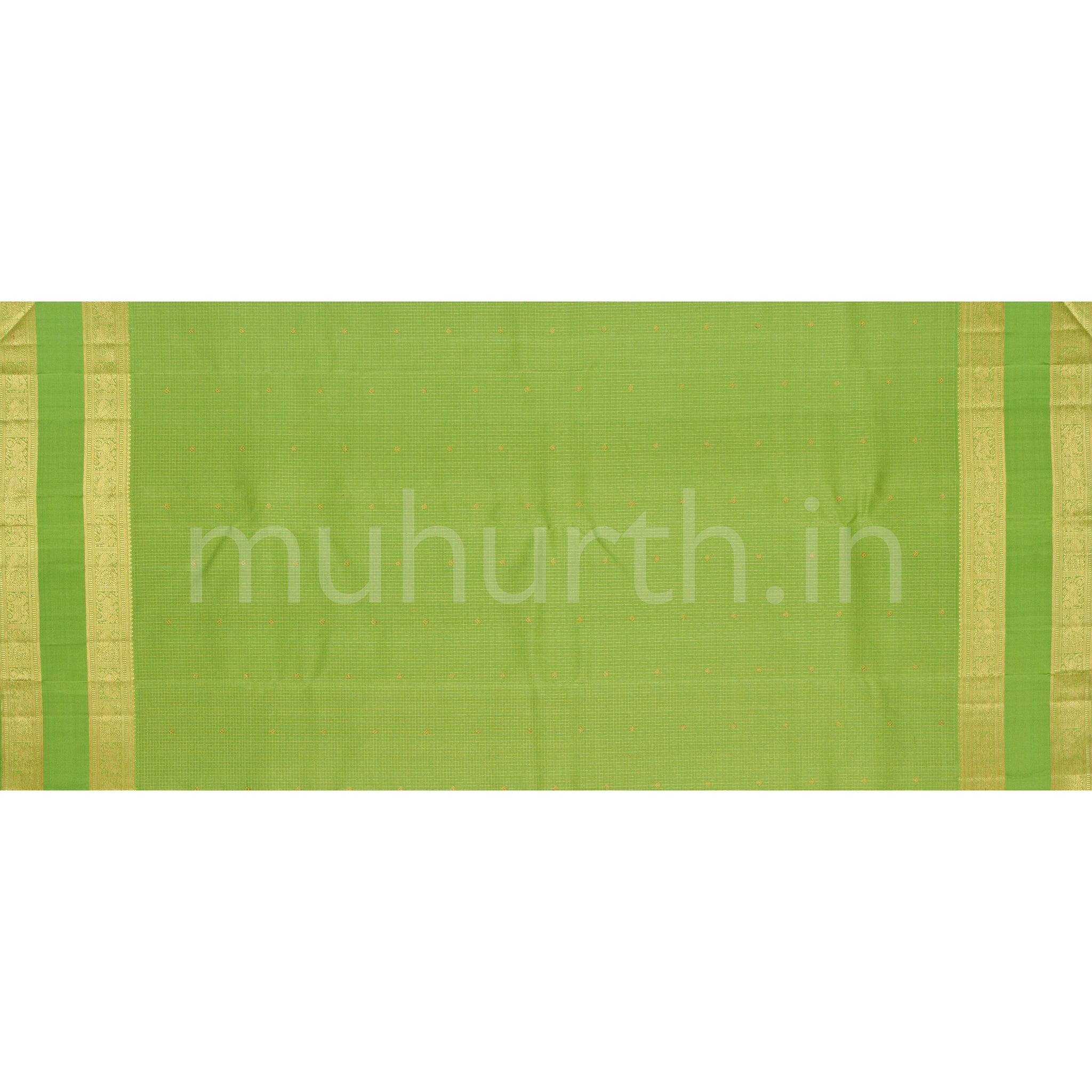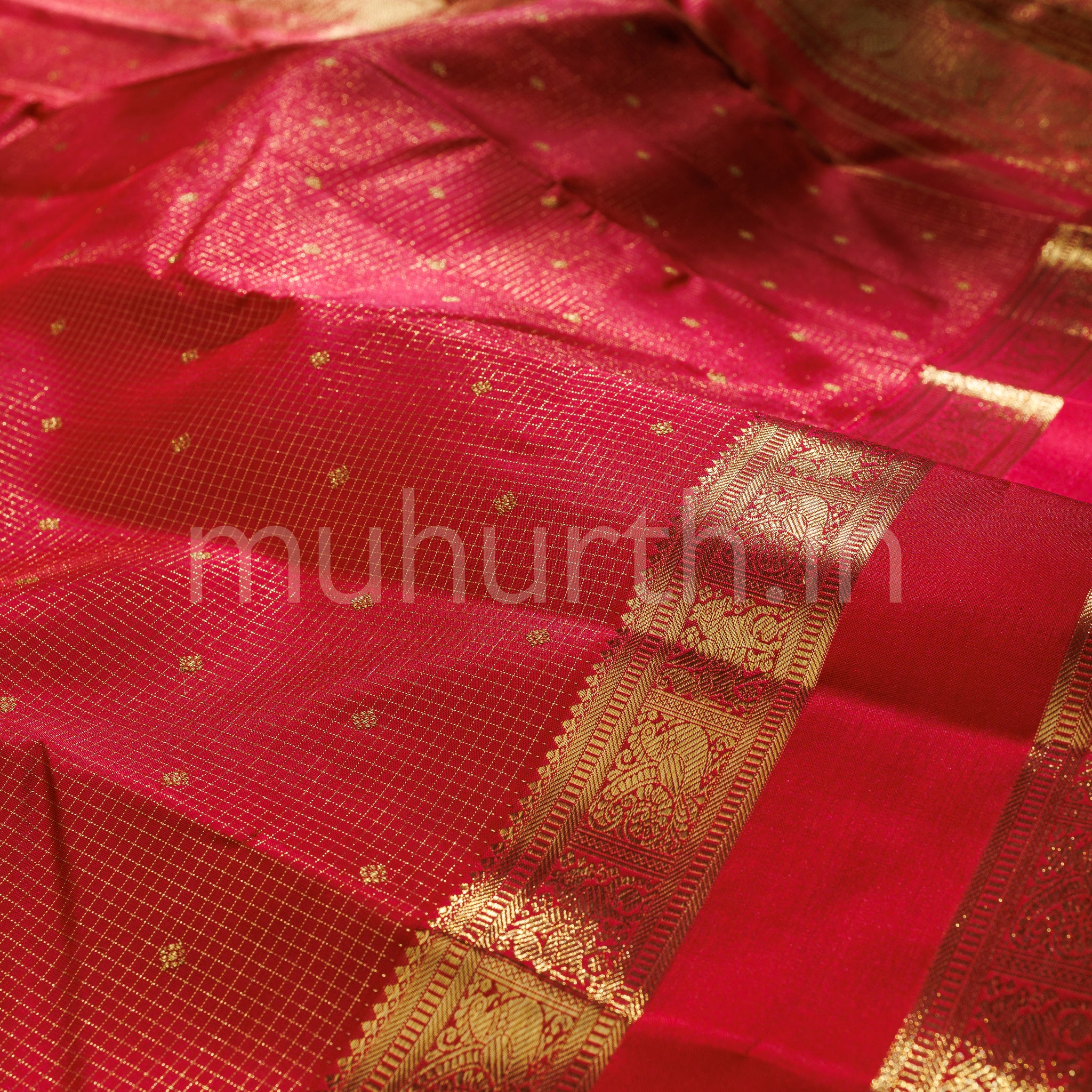 This bright red pure zari Kanjivaram silk saree is a classic expression of traditional artistry. The body is woven in vaira oosi kattam checks, detailed with kamalam buttas that add depth and definition while maintaining a graceful visual flow across the drape. A traditional retta pettu border, richly adorned with grand peacock motifs, frames the saree beautifully, complemented by a light green selvedge that offers a refined contrast.The grand pallu extends the design language of the border, reinforcing the saree’s timeless appeal. Finished with a contrast green checked blouse that echoes the selvedge and body detailing, this saree is an elegant choice for weddings and meaningful beginnings, rooted in tradition and crafted to be cherished.