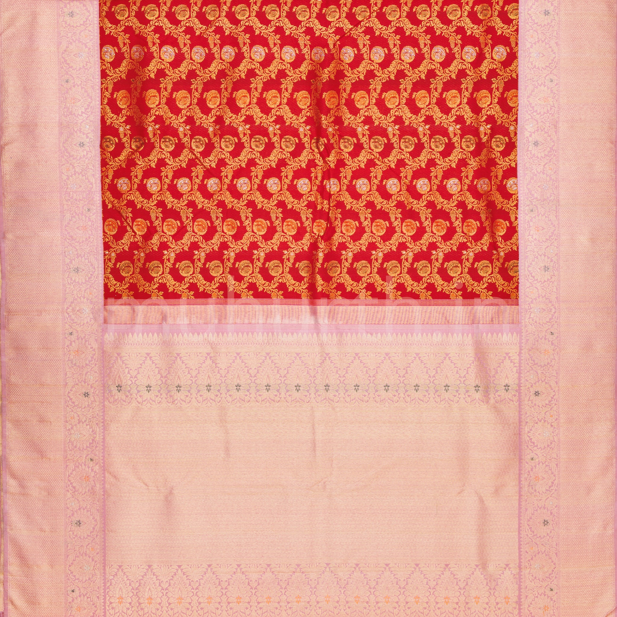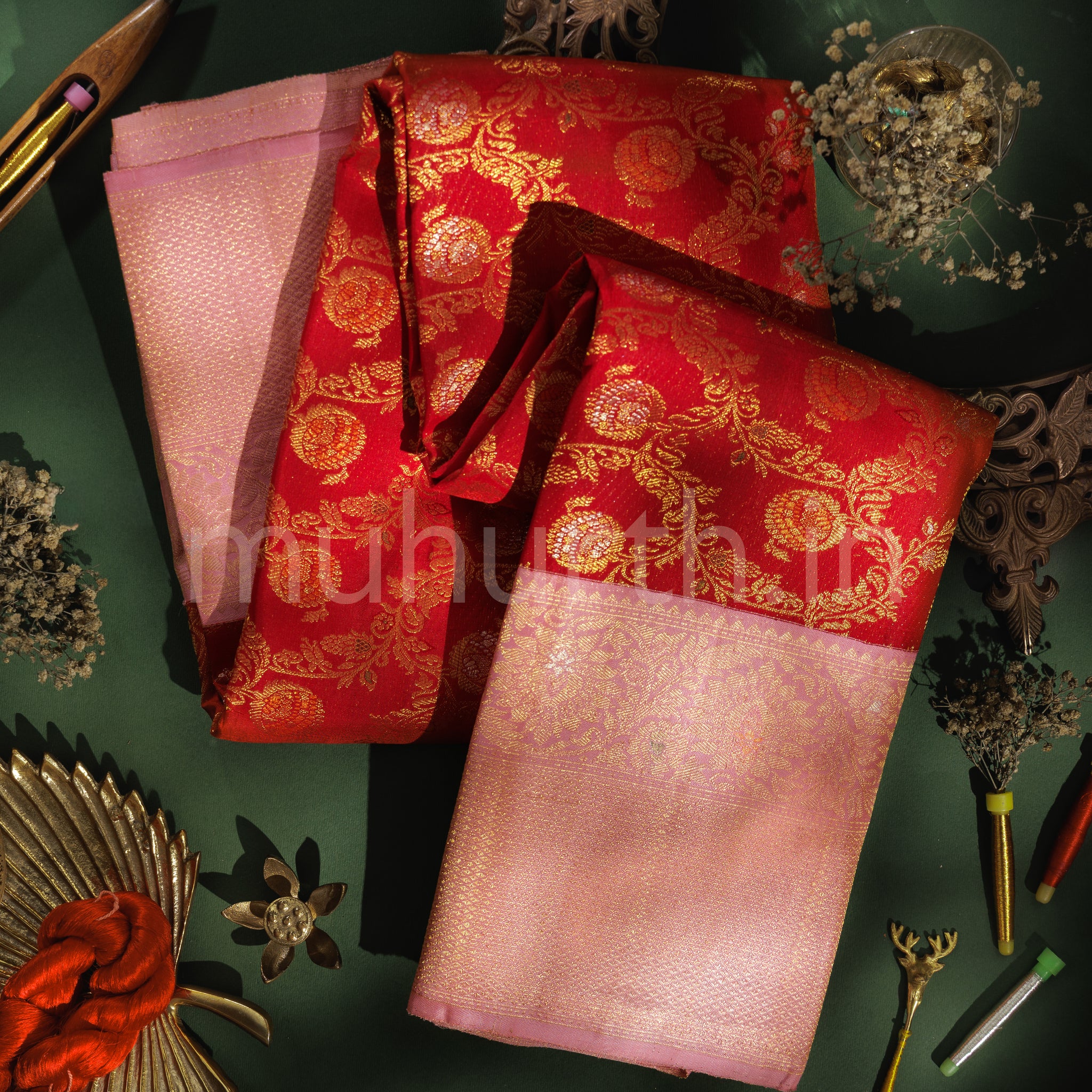 Attributes: Bright Red Pure Meenakari Pure Kanjivaram Silk Saree with Peach