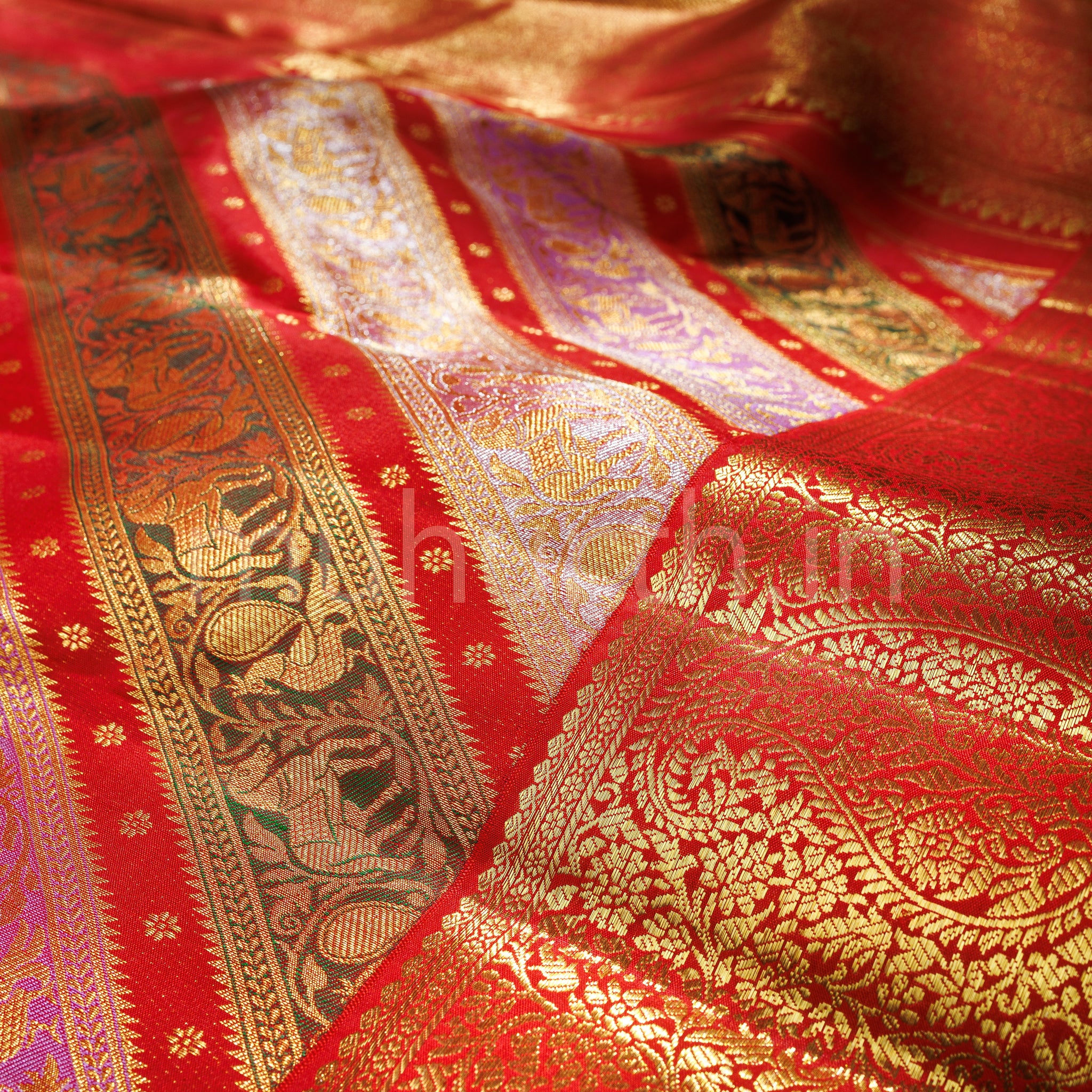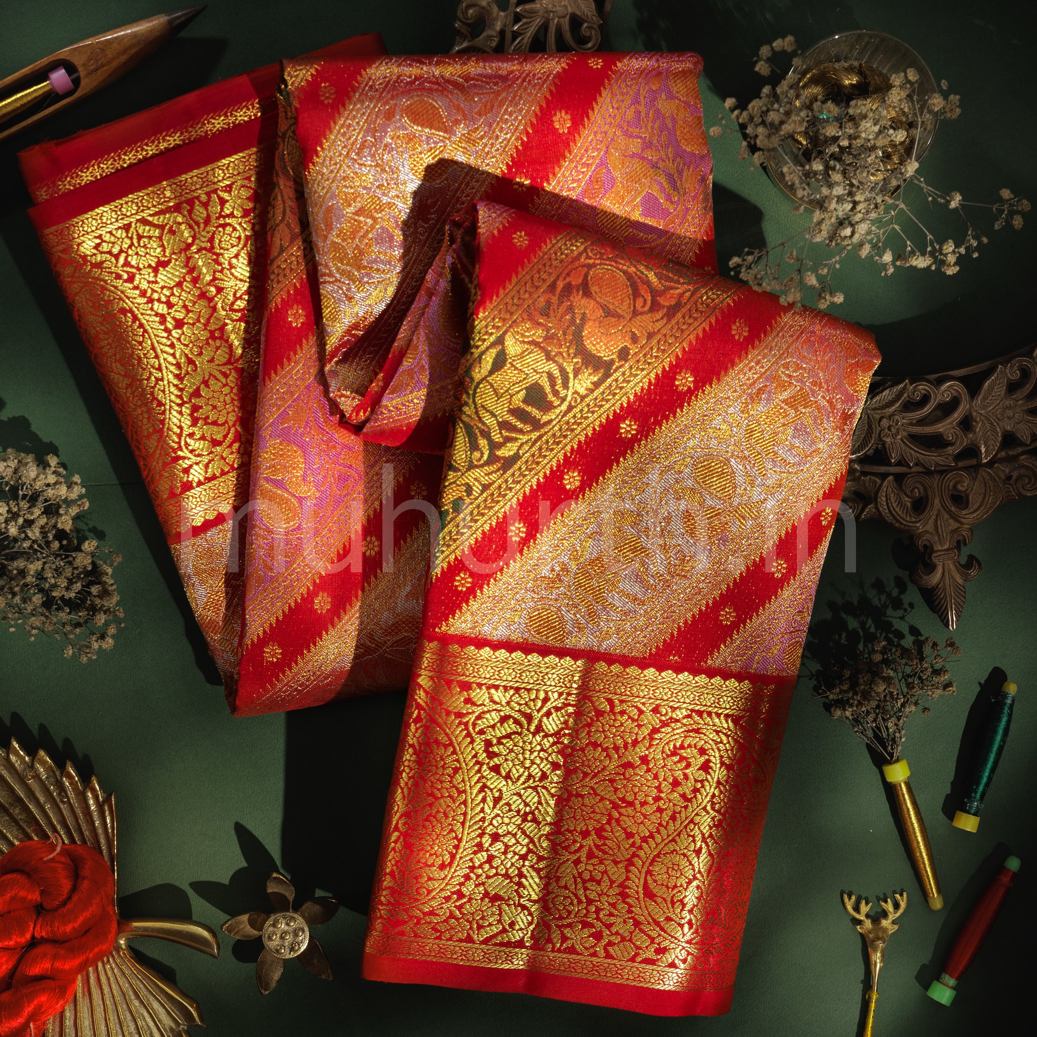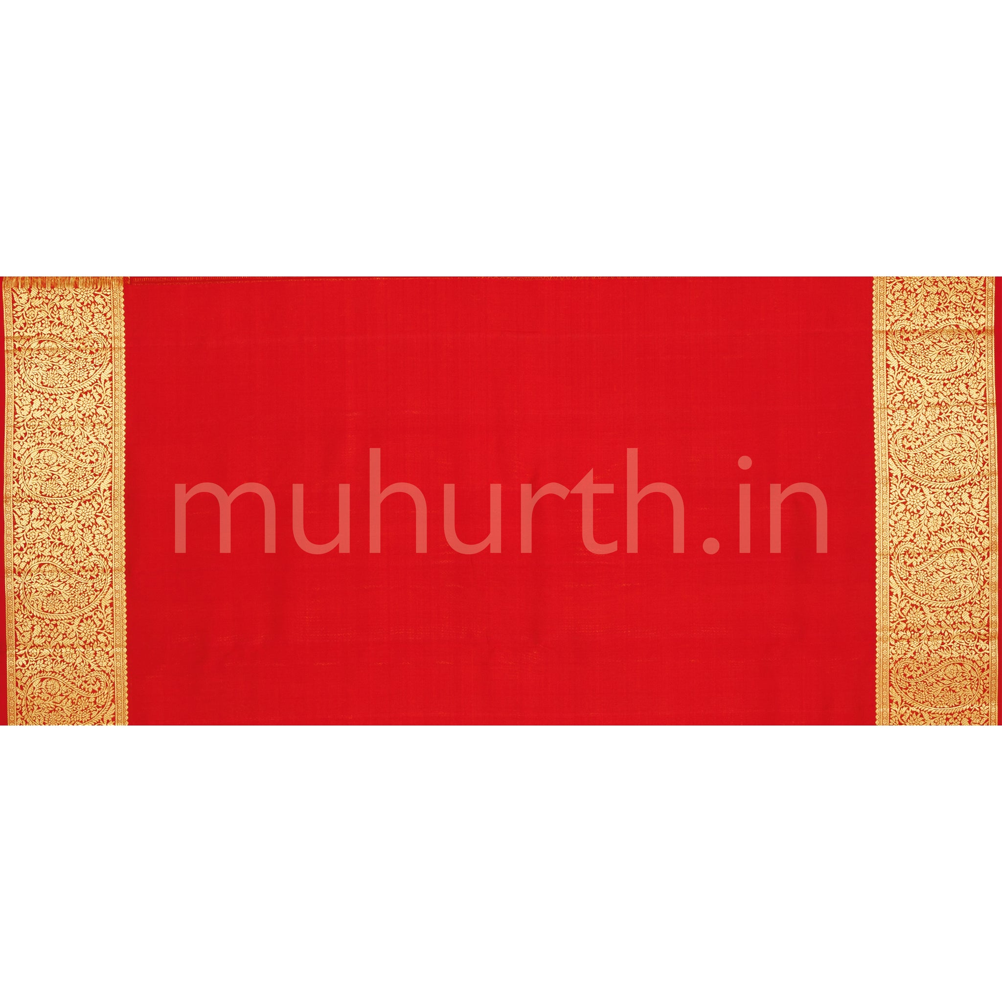 Attributes: Bright Red Rangkat Pure Bridal Kanjivaram Silk Saree