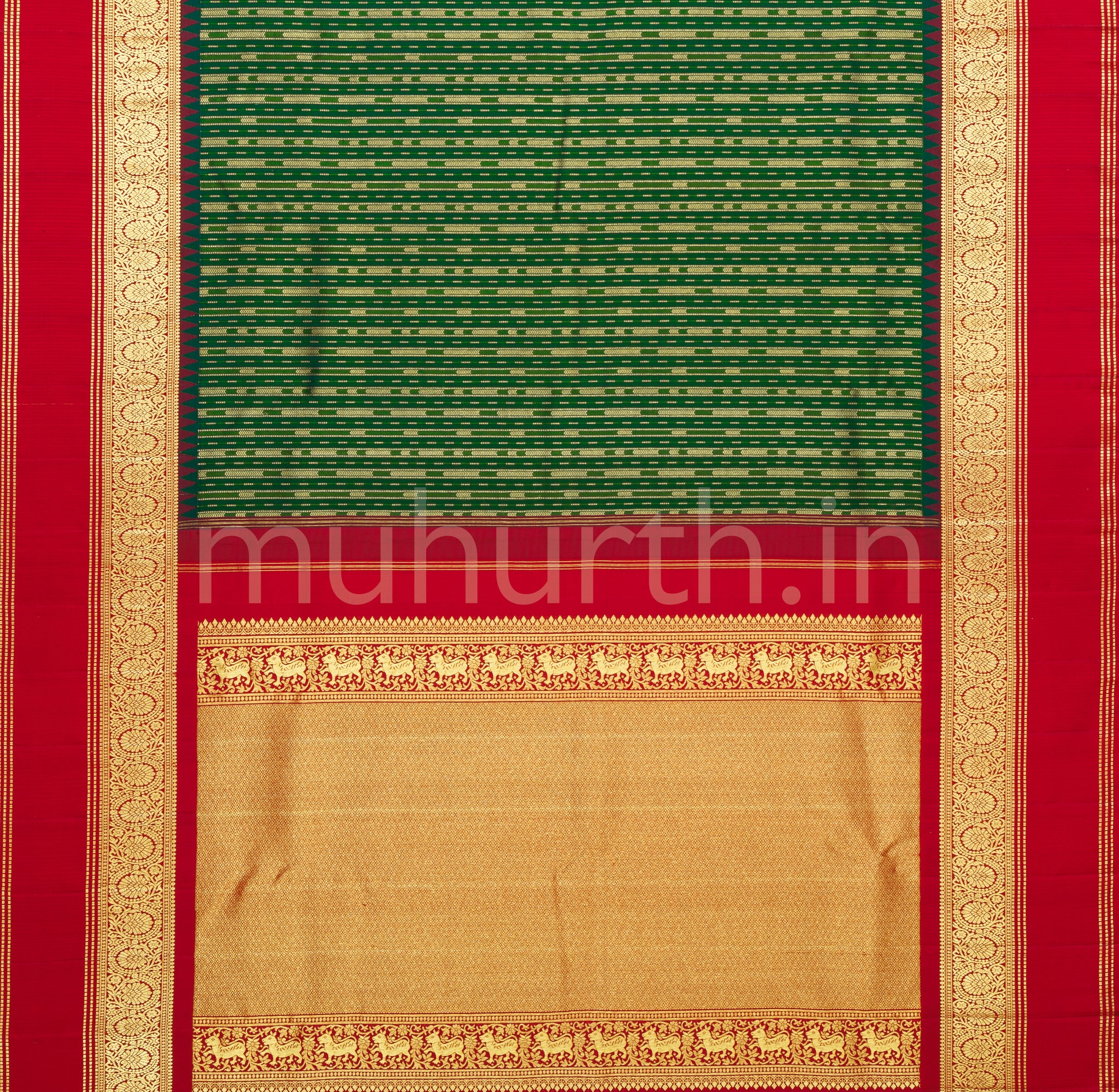 Attributes: Dark Green Pure Kanjivaram Silk Saree with Bright Red