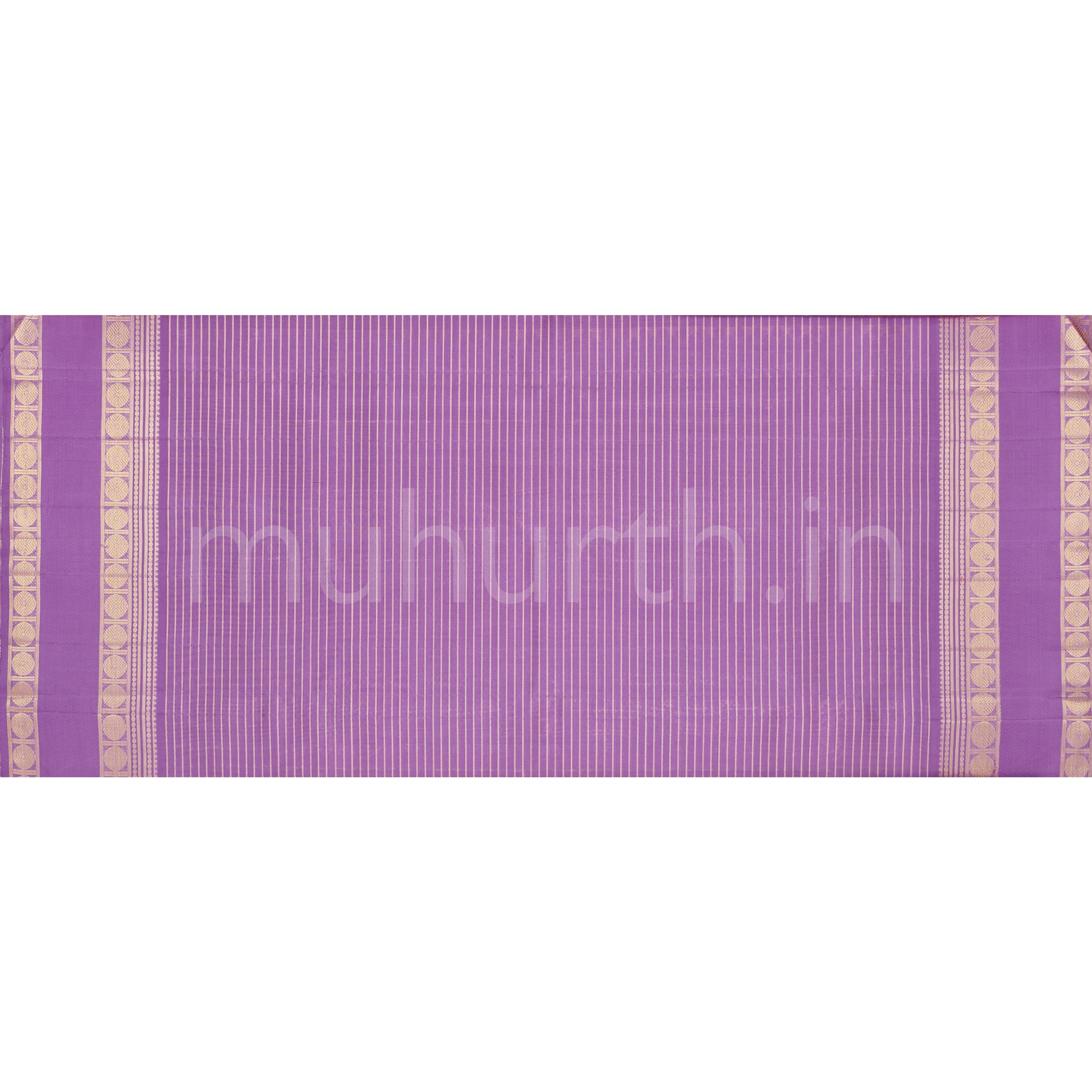 This elaichi pure organza tissue Kanjivaram silk saree with lavender stands out for its light, translucent drape and refined traditional character. The body is woven with vaira oosi checks and dual-tone buttas, creating a soft shimmer and a graceful translucent visual flow across the saree. A traditional retta Korvai pettu border, detailed with rudraksh buttas balances the delicacy of the organza with classic Kanjivaram strength. Midway through the weave, the true distinction of this saree becomes evident combining an organza tissue body with a traditional Korvai border demands exceptional precision. The self pallu carries the same traditional language, paired with a vaira oosi striped blouse for a composed finish. Elegant and rare in make, this saree is a refined statement piece, ideal for special occasions that call for understated luxury and craftsmanship.
