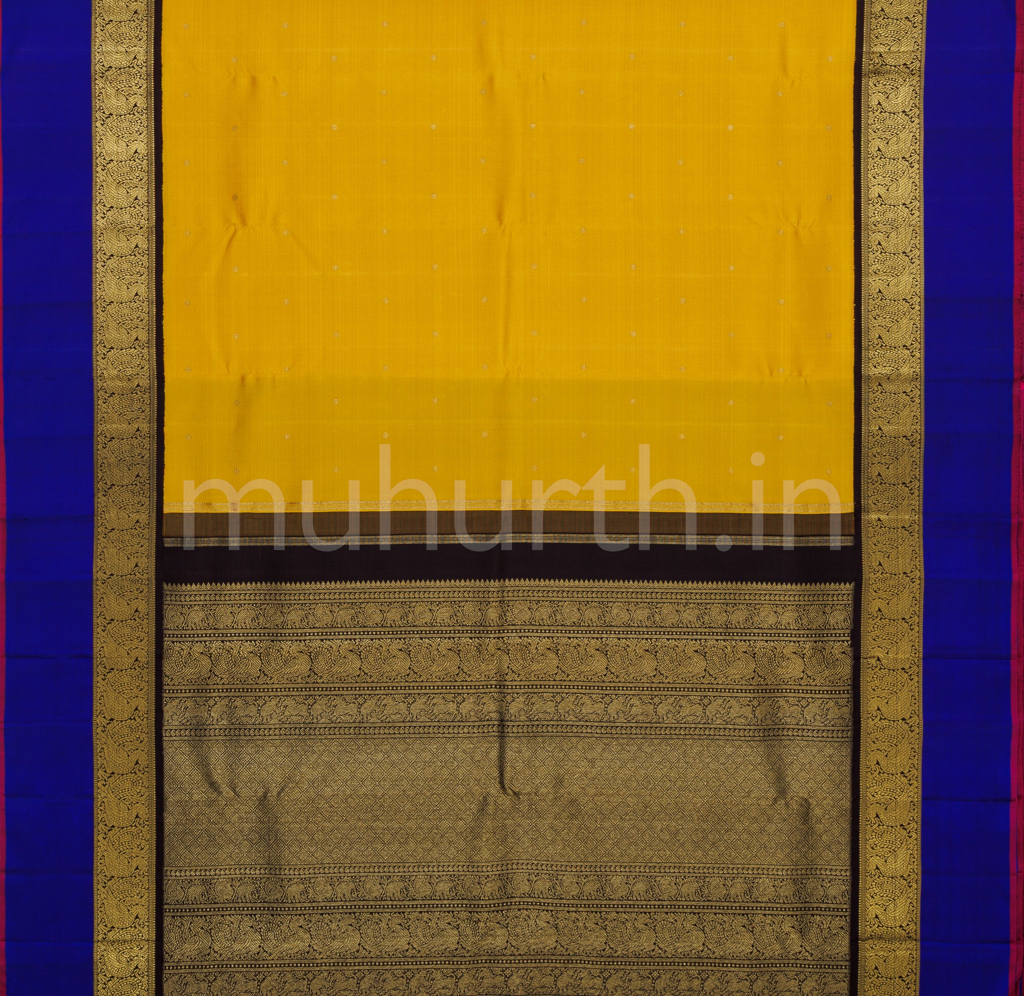 Attributes: Golden Mustard Pure Zari Kanjivaram Silk Saree with Pakku and Violet