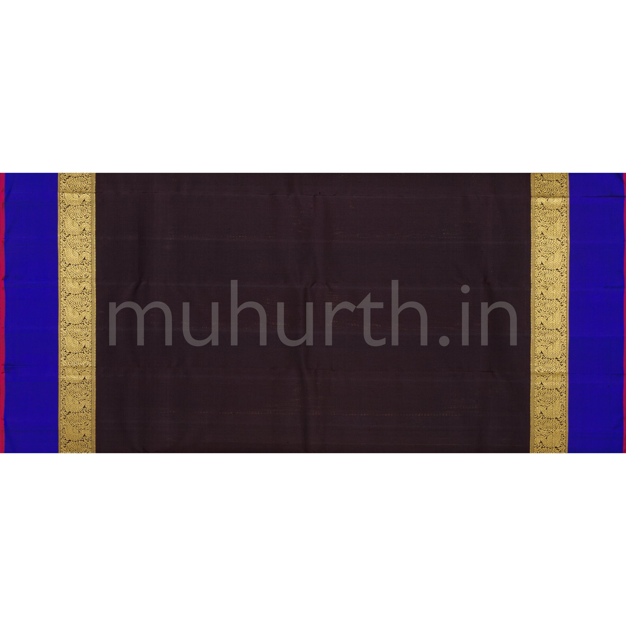 Rendered in a regal golden mustard, this pure zari Kanjivaram silk saree reflects classic South Indian craftsmanship and traditional colour harmony. The body is detailed with neatly arranged kamalam buttas, lending the drape a structured and timeless appeal. Framing the saree is a Kaal Eragina Korvai Pettu border in pakku or betel nut tone, gracefully curated with royal annam motifs, and enhanced with a wide violet band and magenta selvedge highlight that adds a refined contrast. The rich traditional pallu, designed in harmony with the border, completes the saree with ceremonial elegance. Paired with a plain blouse, this saree is a distinguished choice for weddings, arangetrams, and traditional occasions, offering a balance of heritage, richness, and enduring style.