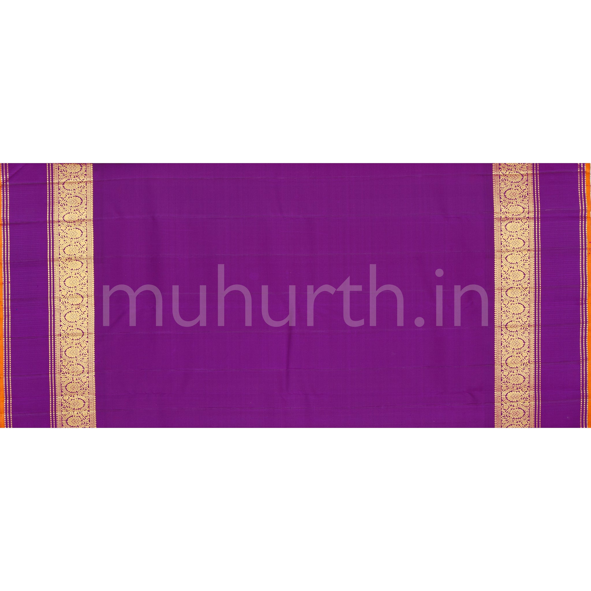 A delicate symphony of tradition and modern elegance, this Kanjivaram silk saree captures the quiet power of artisanal mastery. The body, adorned with vertical stripes in the intricate double nada technique, shimmers with quiet sophistication, reflecting the meticulous artistry of the weave. A Meenakshi purple Korvai getti pettu border, separated by a temple rek, introduces a regal contrast, intricately detailed with classic Kanchipuram motifs that anchor the saree in tradition. The grand pallu, echoing the border’s artistry, completes a fluid, majestic drape, while a plain blouse ensures the silk and motifs remain the centerpiece. Perfect for weddings, festive soirées, and curated celebrations, this saree is a heritage-rich, statement-making creation where tradition, modernity, and understated luxury converge effortlessly.