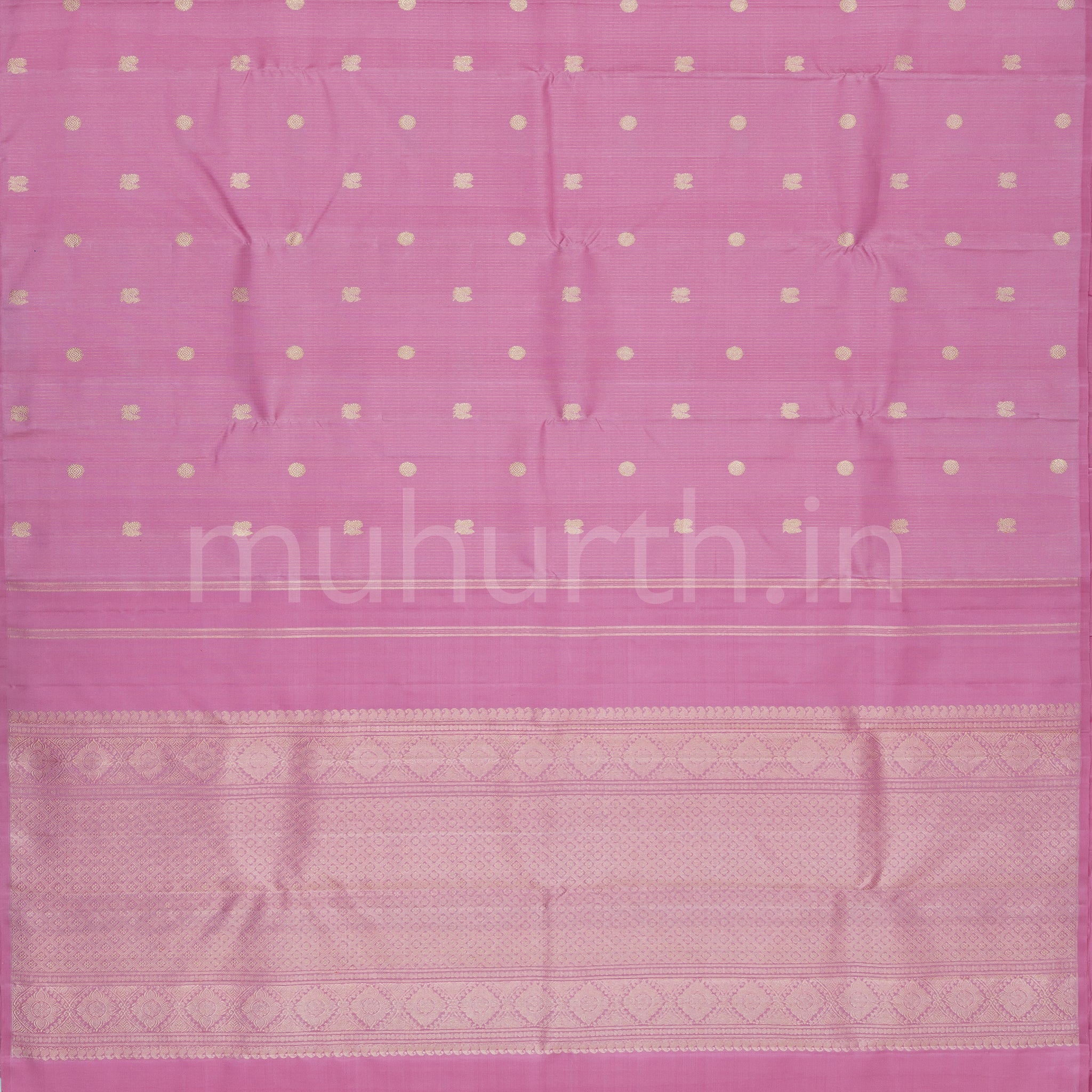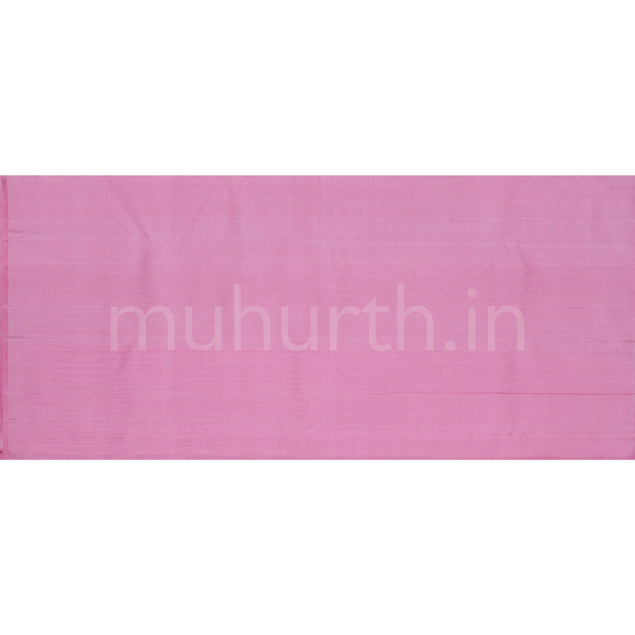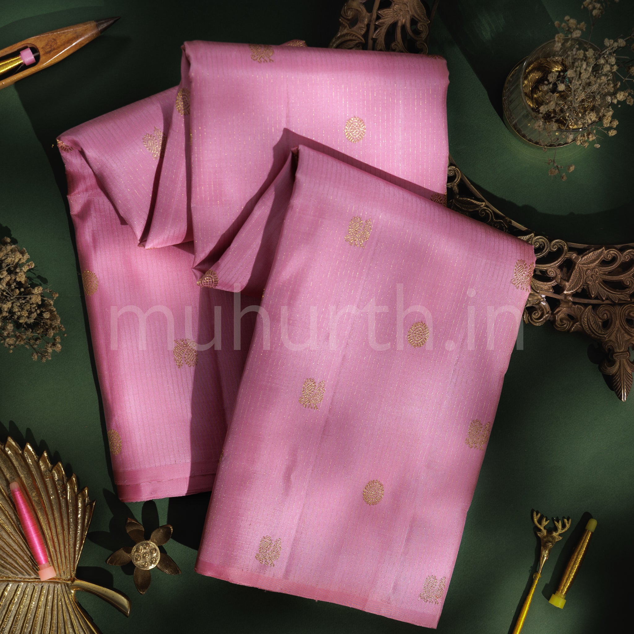 Softly rendered in a light pink hue, this Pure Zari Kanjivaram silk saree carries a gentle elegance that feels both refined and effortless. The body is woven with vertical Vaira Oosi lines, punctuated by delicate Annam and Chakram buttas, creating a graceful visual rhythm without the presence of a border. Finished with a rich self pallu that quietly elevates the drape and paired with a plain blouse, the saree remains light in weight and easy to carry. An elegant, pleasing choice for everyday wear, intimate gatherings, and smaller occasions, where simplicity and craftsmanship come together beautifully.