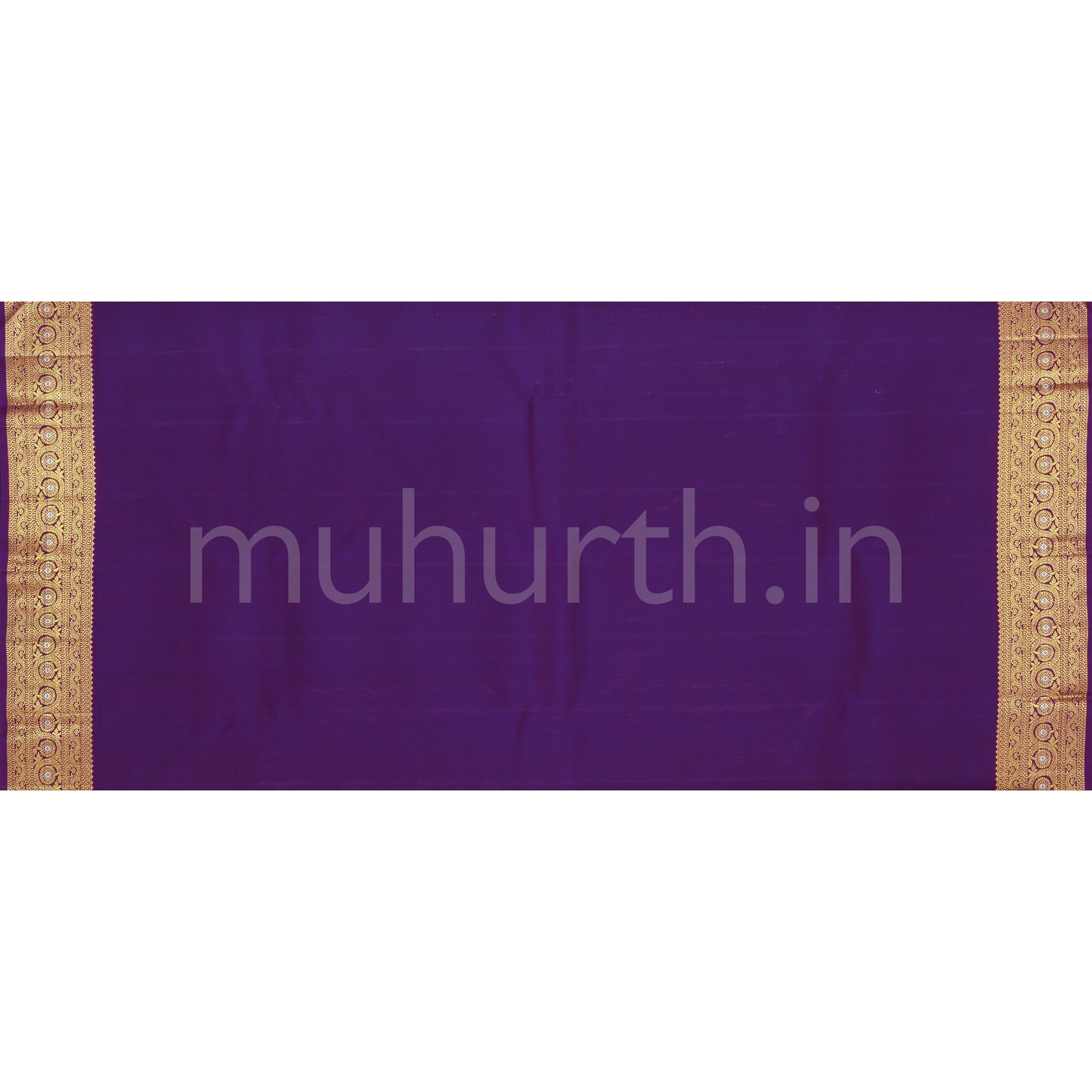 Radiant in vibrant orange, this Kanjivaram silk saree combines heritage craftsmanship with understated sophistication. The body is adorned with fusion floral buttas, spaced thoughtfully to highlight the silk’s natural sheen and elegance. The deep Meenakshi/purple Korvai border, enriched with intricate Meenakari detailing, adds depth and a regal contrast, while the densely woven pallu mirrors the traditional motifs for a harmonious finish. Styled with a plain matching blouse, this saree is a timeless choice for weddings, festive celebrations, and special occasions, offering a refined statement of elegance and enduring beauty.