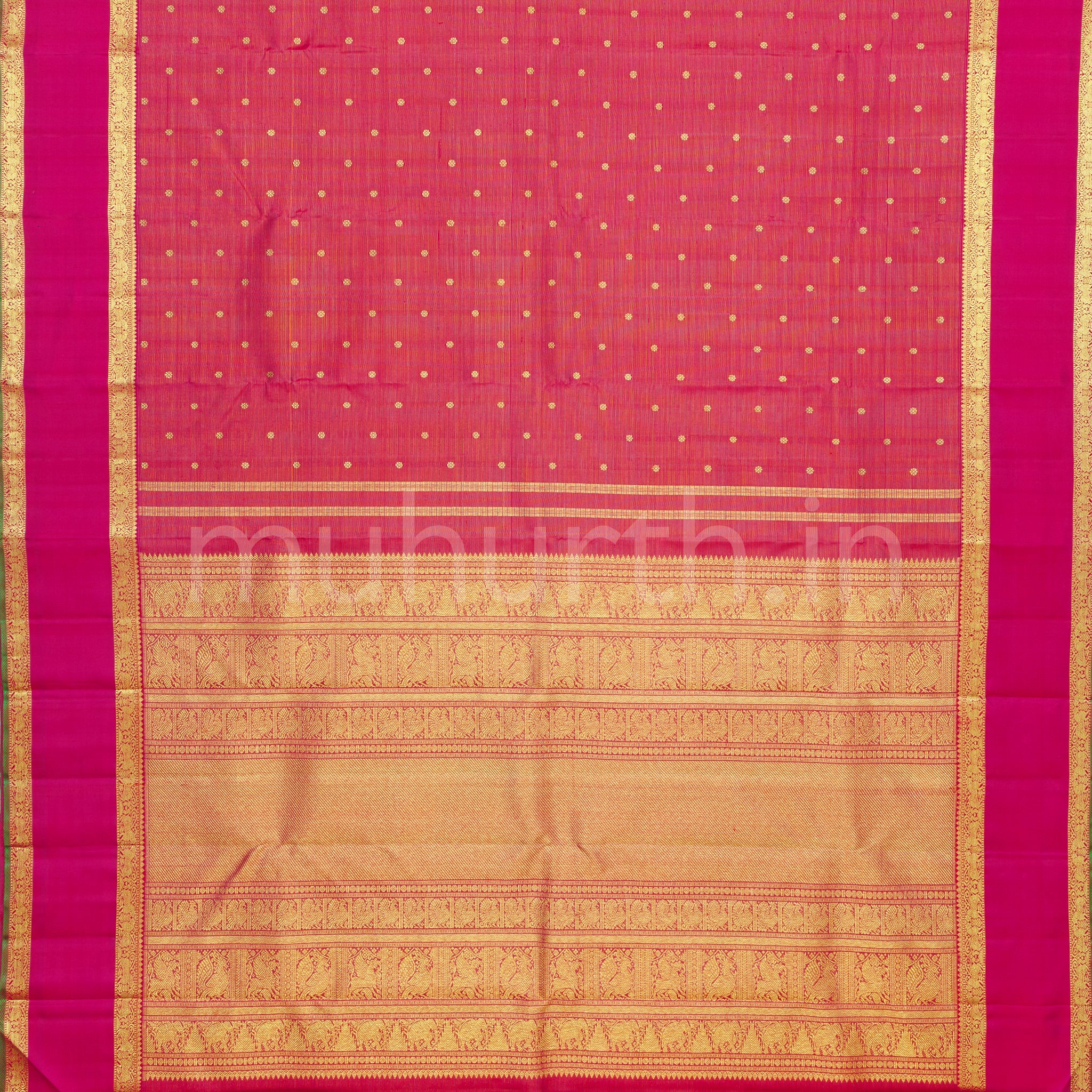 Draped in a ruby magenta glow, this Kanjivaram silk saree carries the quiet confidence of a timeless classic. The body unfolds with finely worked Vaira Oosi detailing, punctuated by graceful kamalam buttas that lend a measured richness rather than excess. Framing the weave is a traditional Retta Pettu border, where spirited horse motifs are rendered with precision, gently lifted by a contrasting green selvedge that adds character without distraction. The traditional pallu, generous and poised, anchors the saree in tradition, while the oosi-striped blouse offers a seamless finish. Vintage in spirit and refined in expression, this saree is made for moments that call for elegance and celebrations that linger in memory.