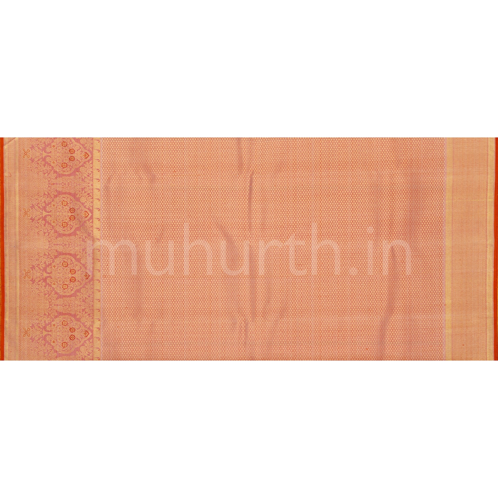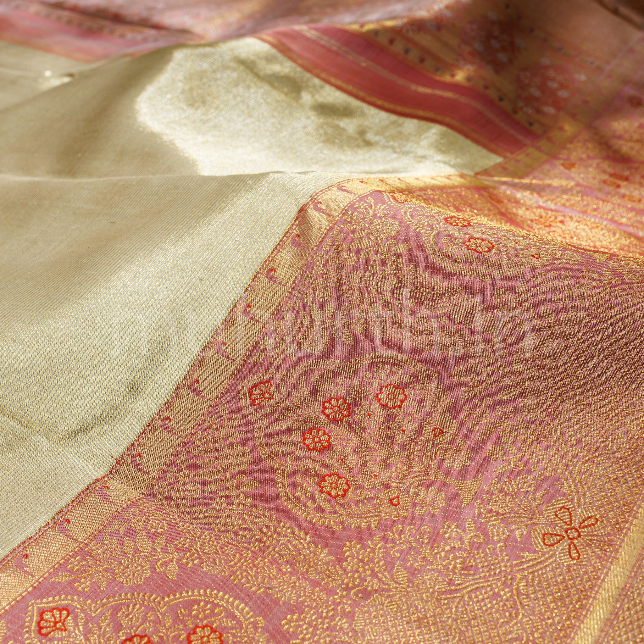 Attributes: Tussar White Half Tissue Pure Kanjivaram Silk Saree with Peach