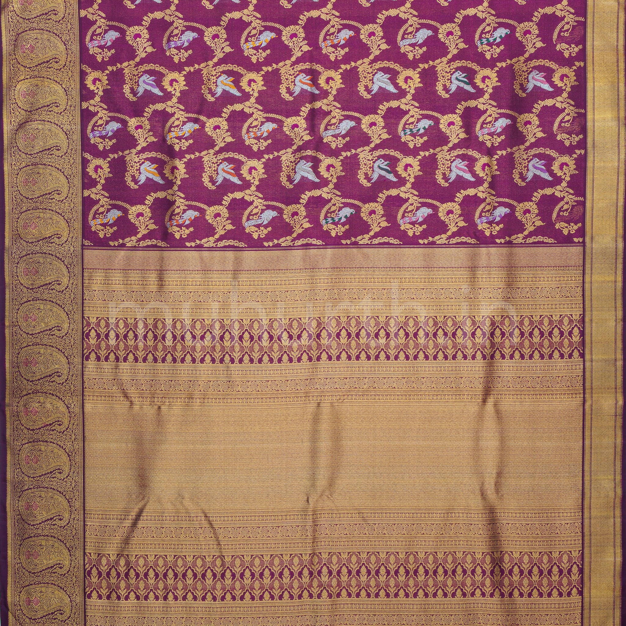 This wine pure Kanjivaram silk saree stands out for its depth of colour and refined craftsmanship. The body is woven with an intricate floral jaal in zari, interspersed with parrot motifs highlighted by Meenakari detailing, creating a design that reveals its richness as the saree is draped. The motifs are thoughtfully placed, allowing the parrots to emerge with clarity and movement across the fabric. Complementing the body is a turning border, detailed with intricate paisley motifs, adding structure and balance to the overall composition. The grand pallu, designed to harmonise with the richness of the body, completes the saree with ceremonial elegance. Finished with a brocade blouse, this saree is an excellent choice for weddings, festive celebrations, and special occasions, bringing together colour, craftsmanship, and timeless appeal.