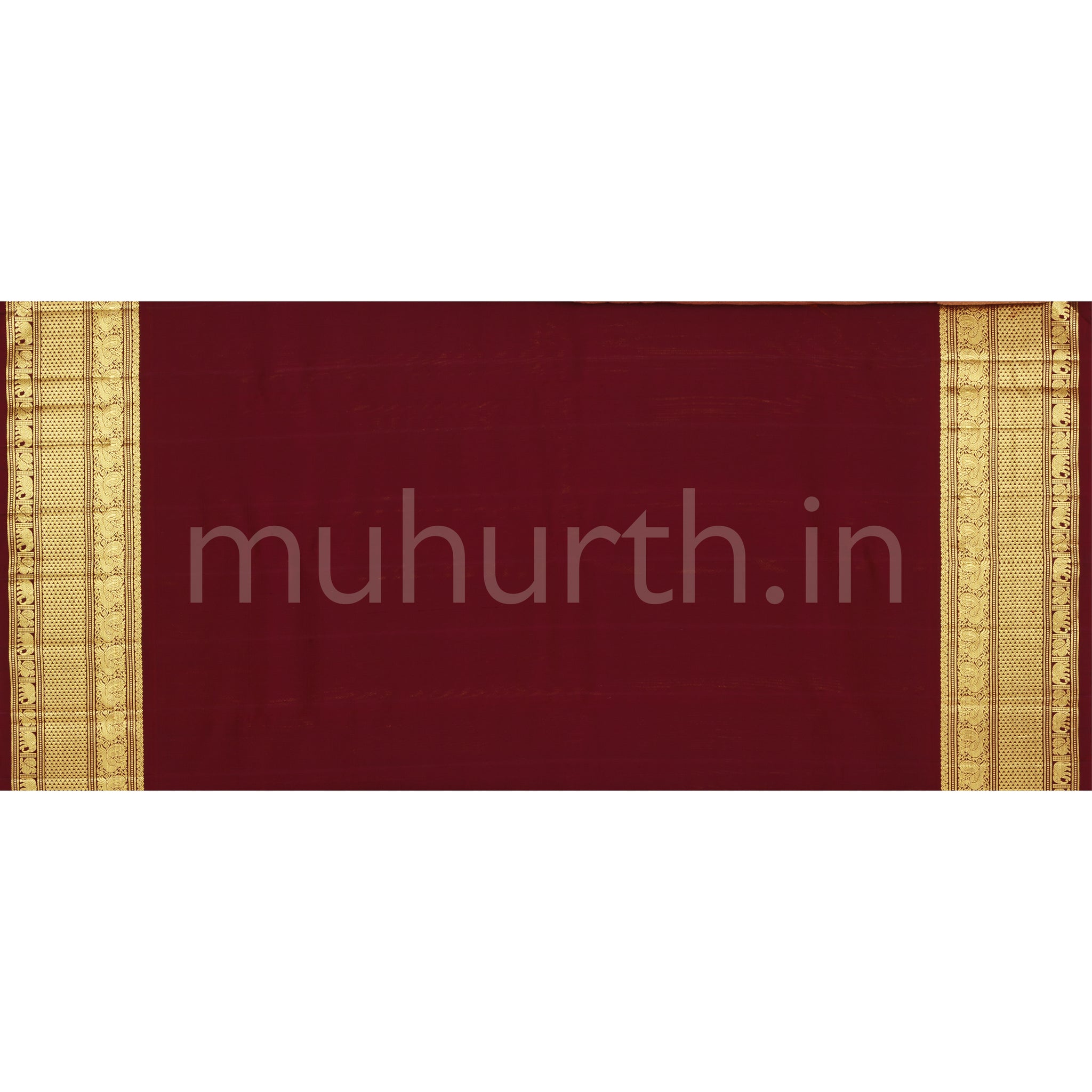 A rare expression of bridal artistry, this Ananda Kora Organza Kanjivaram silk saree brings together two demanding traditions in perfect harmony. The sheer kora organza body, woven with Veldhari checks and delicately placed buttas, creates an ethereal lightness that is both regal and refined. Framing this translucence is a masterfully executed Korvai Getti Pettu border, enriched with elephant and annam motifs, woven with precision and ceremonial grandeur. The interplay of an airy organza weave with the strength of traditional Korvai craftsmanship makes this saree an exceptional feat crafted by only the most skilled master weavers. A grand traditional pallu unfolds with stately presence, while the plain blouse allows the weave to remain the focal point. Opulent yet poised, this saree is crafted for bridal moments, sacred rituals, and celebrations that call for timeless elegance and enduring craftsmanship.