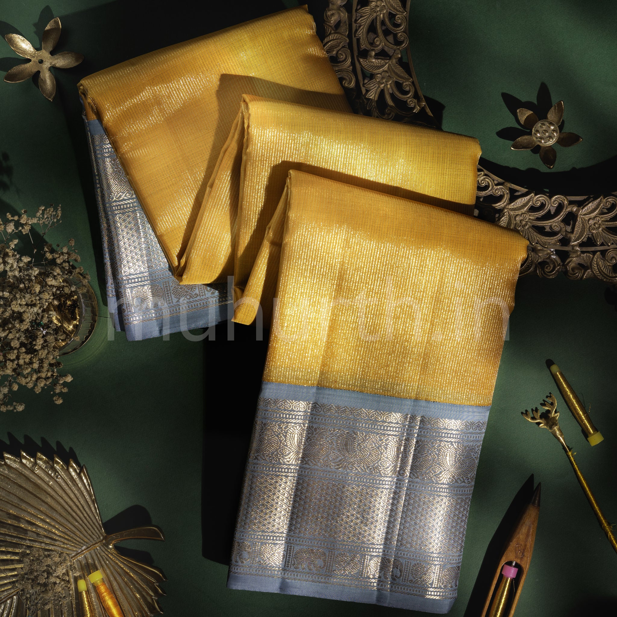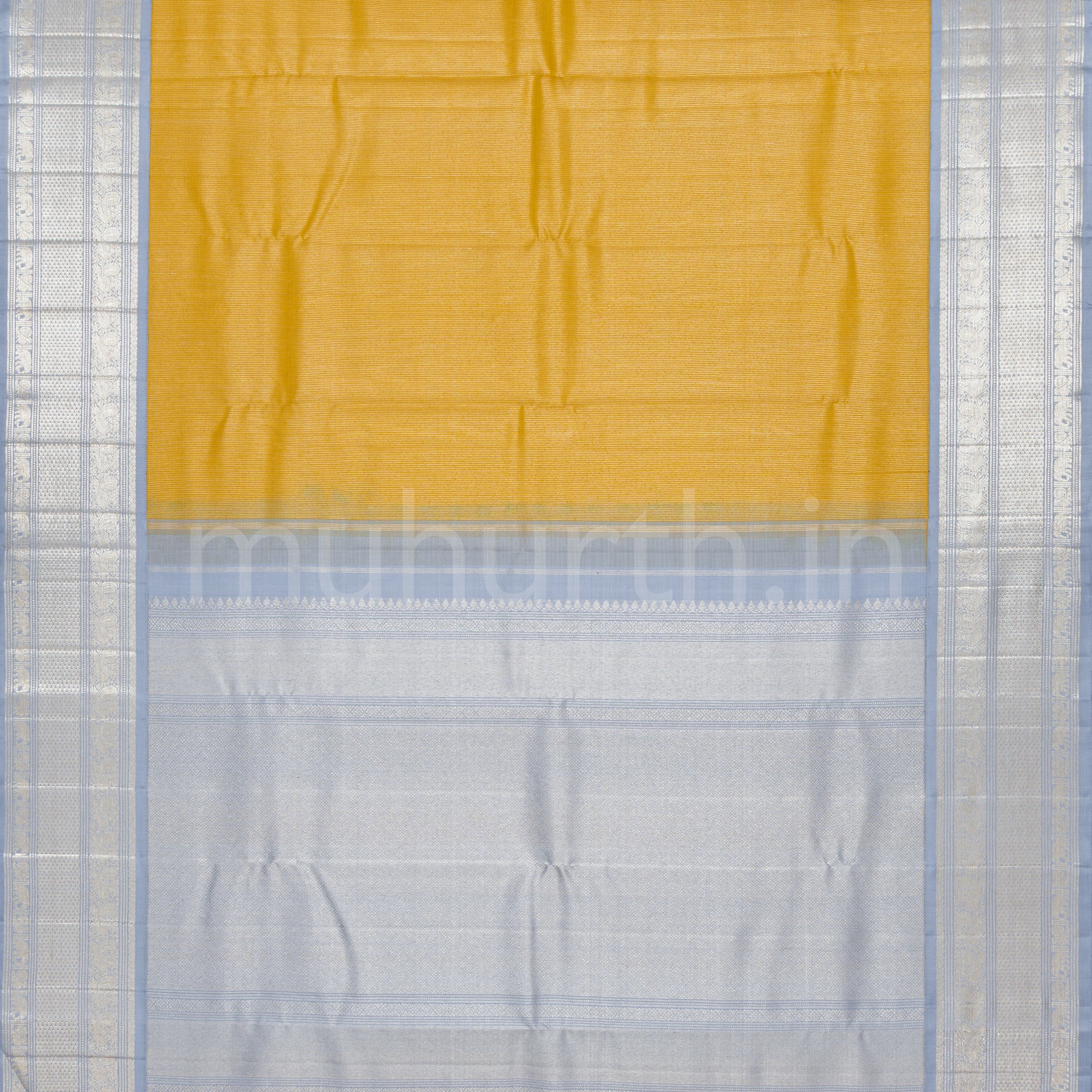Attributes:Golden Mustard Pure Kanjivaram Silk Saree with Silver Grey