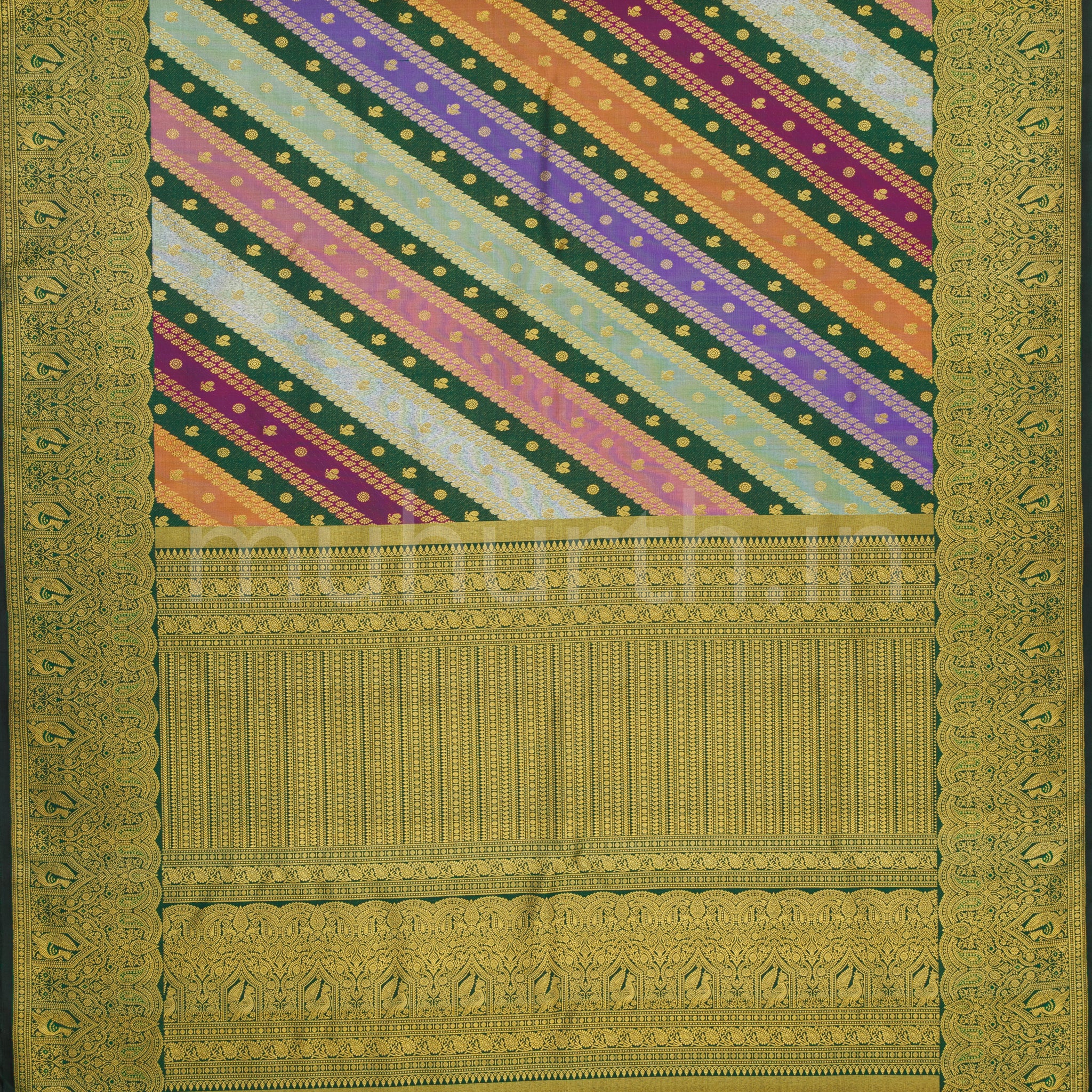 Woven in regal dark green, this saree features a body in exquisite Rangkat weaving, adorned with Annam and Chakram motifs that shimmer with meticulous artistry. The traditional Korvai-style border and grand pallu, enriched with classic Kanchipuram motifs, offer a timeless counterpoint to the intricate Rangkat body, creating a composition that feels both powerful and poised. Each fold reveals layered texture, depth, and a measured sheen that enhances the saree’s luxurious presence. Paired with a matching dark green brocade blouse, this exclusive Muhurth creation is crafted for weddings, receptions, and special celebrations, an expression of heritage craftsmanship shaped with refined elegance and lasting distinction.