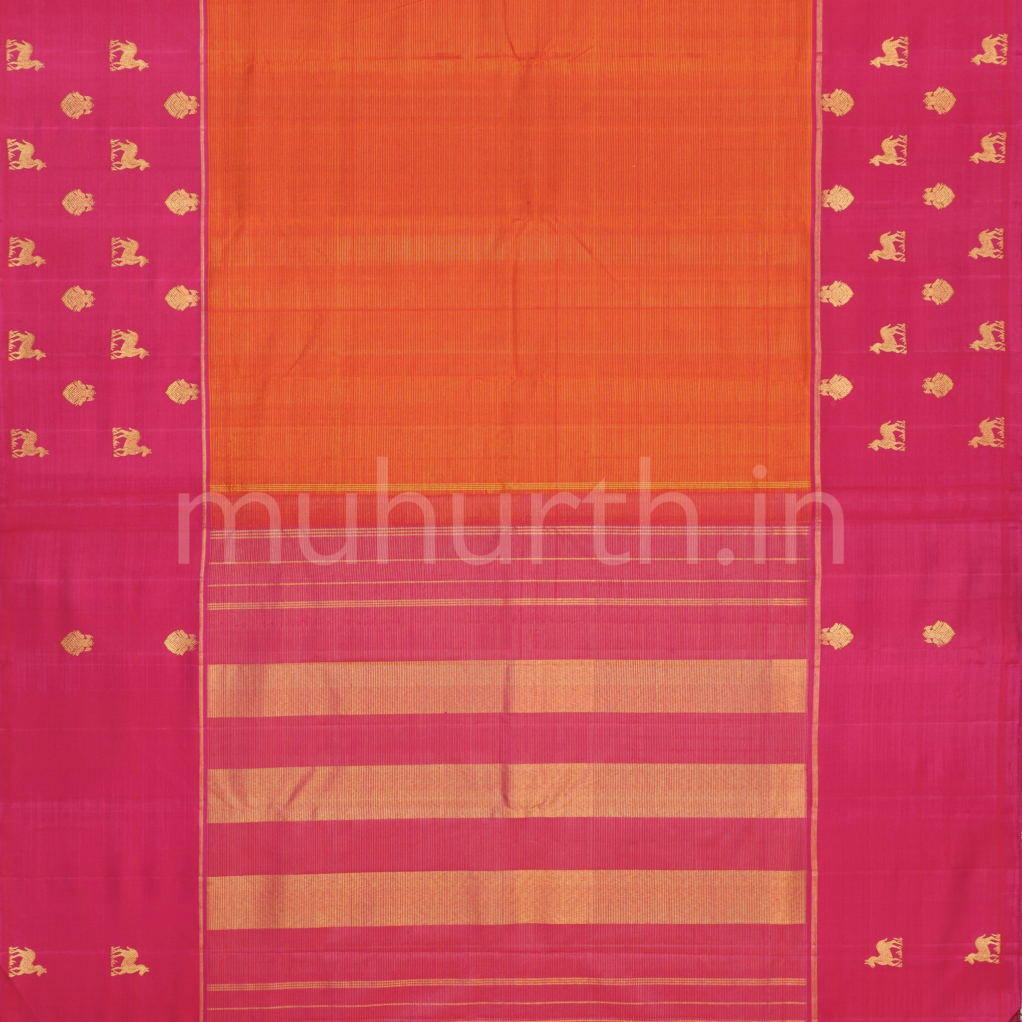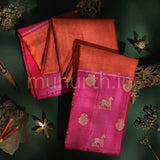 A striking bright orange pure Kanjivaram silk saree, gracefully woven with classic vaira oosi detailing that lends subtle texture and depth to the radiant silk weave. The saree is framed with a broad rani pink border adorned with distinctive horse and peacock motif, bringing a lively traditional character to the weave. A rani pink pallu woven with zari completes the drape, paired with a pink vaira oosi blouse. A graceful choice for wedding functions, festive gatherings, and office celebrations