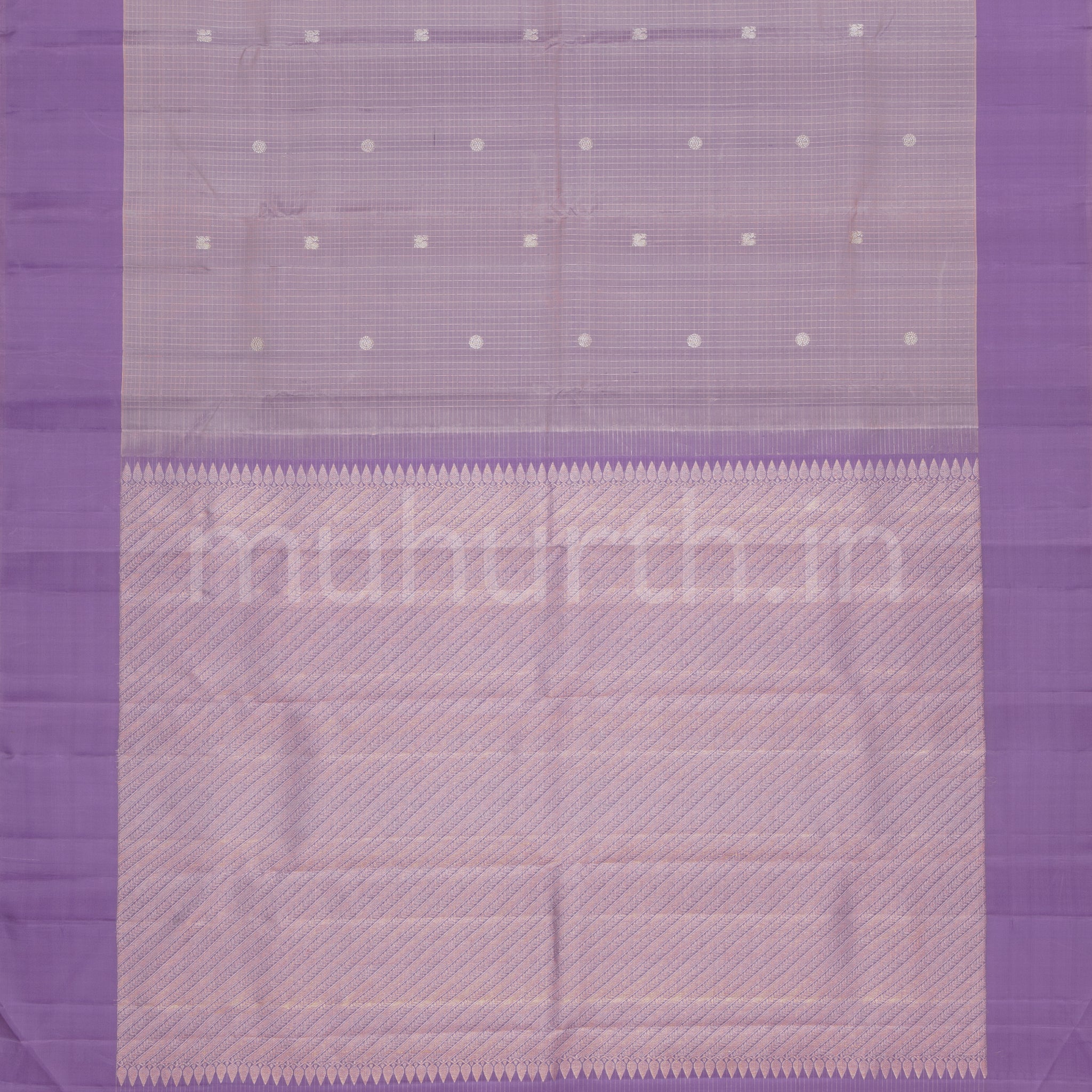 A pastel lavender Kanjivaram silk body meets a slightly deeper lavender border, offering a refined contrast within a single palette. The oosi checks are adorned with delicate annam-chakram buttas in silver zari, while the pallu extends a graceful diagonal floral vine motif. Paired with a lavender-checked blouse, this saree exudes refreshing elegance, ideal for intimate gatherings or refined celebrations.