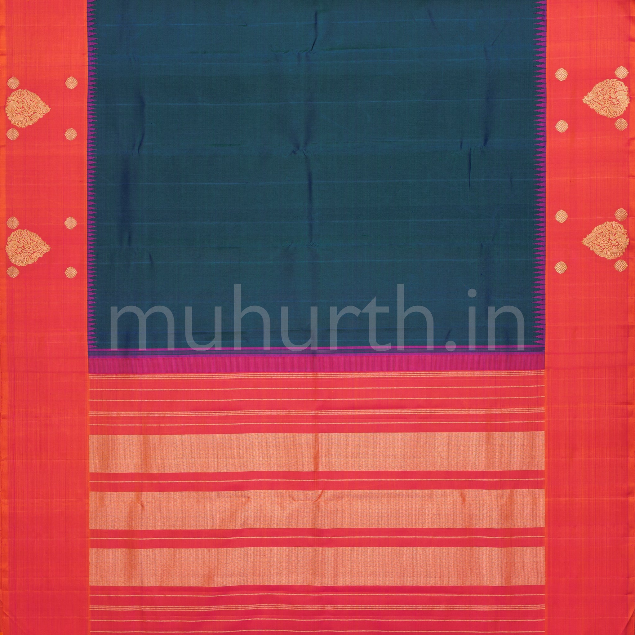 Attributes: Peacock Green Pure Kanjivaram Silk Saree with Rose Orange